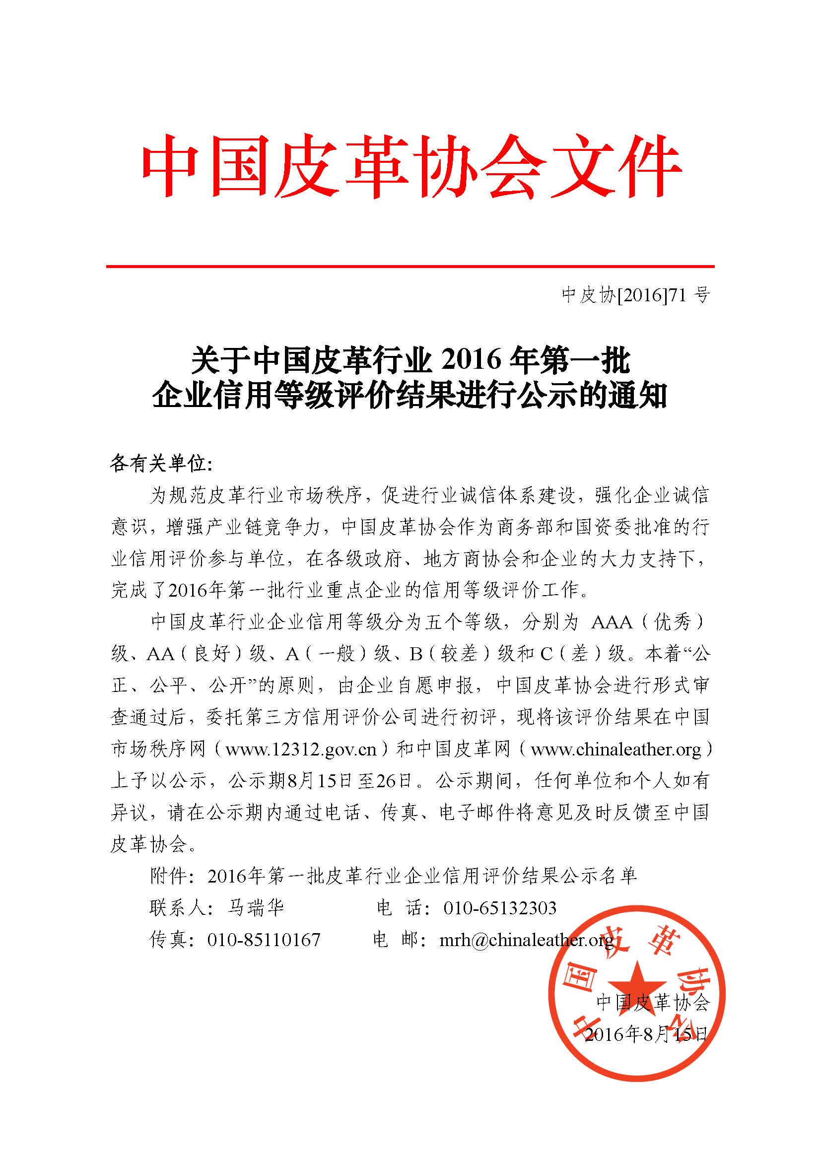 关于中国皮革行业2016年第一批企业信用等级评价结果进行公示的通知