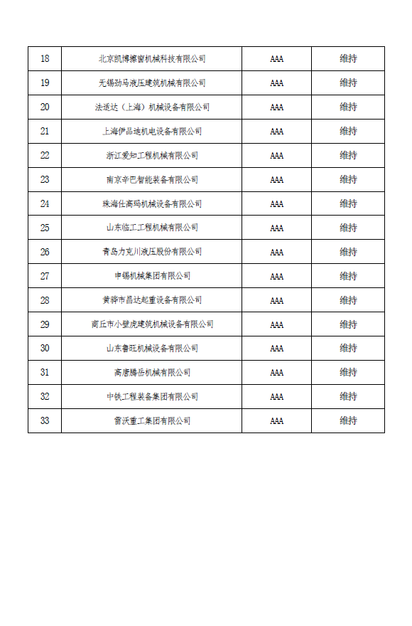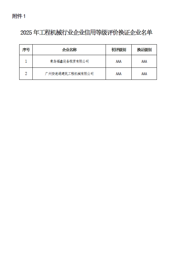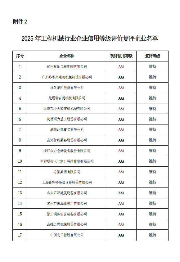 关于工程机械行业企业信用等级评价2025年度换证和复审结果的公示